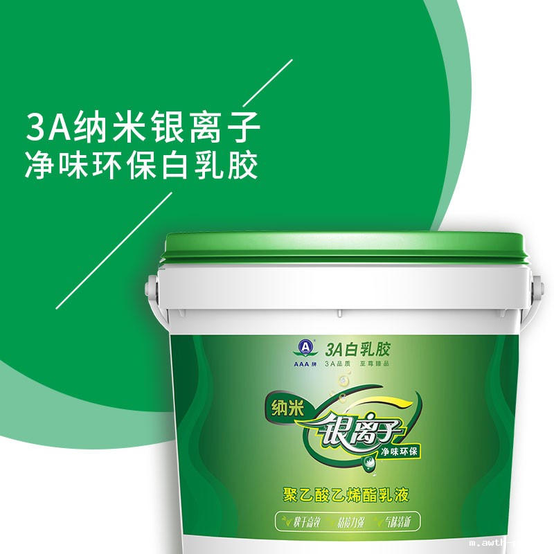 3A环保漆纳米银离子环保白胶-添加高科技纳米银离子,通过接触反应和光催反应,使产品更环保。本品环保无毒、不燃,是由醋酸乙烯酯乳化聚合而成的优质粘合剂,具有高粘性能。