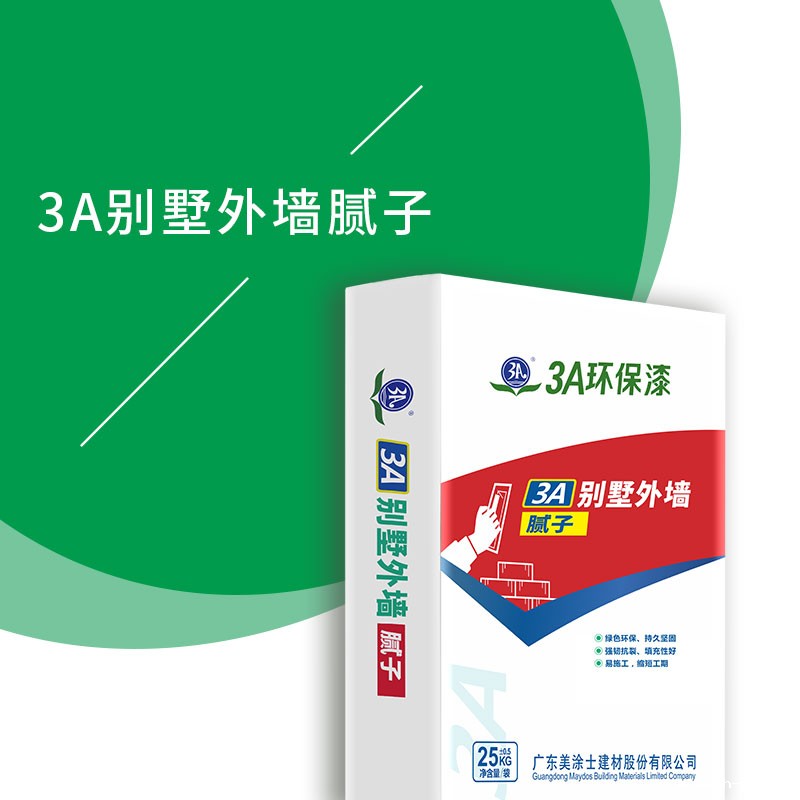 3A别墅外墙腻子,采用高聚合物,无机粘结力料及精选强度增加剂配制而成。加入拌合剂后,将发生适中的化学反应,生成分子结构很小的凝结体,增加分子间的聚合力,使得产品具有高强度,透水率小、附着力佳及封闭性优等特点。