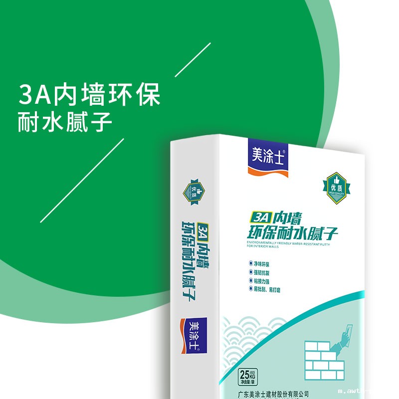 3A内墙环保耐水腻子采用高聚合物、无机粘结力料及精选强度增加剂配制而成。加入拌合剂后,将发生适中的化学反应,生成分子结构很小的凝结体,增加分子间的聚合力,使得产品具有强度高、透水率低、附着力强及封闭性优等特点。