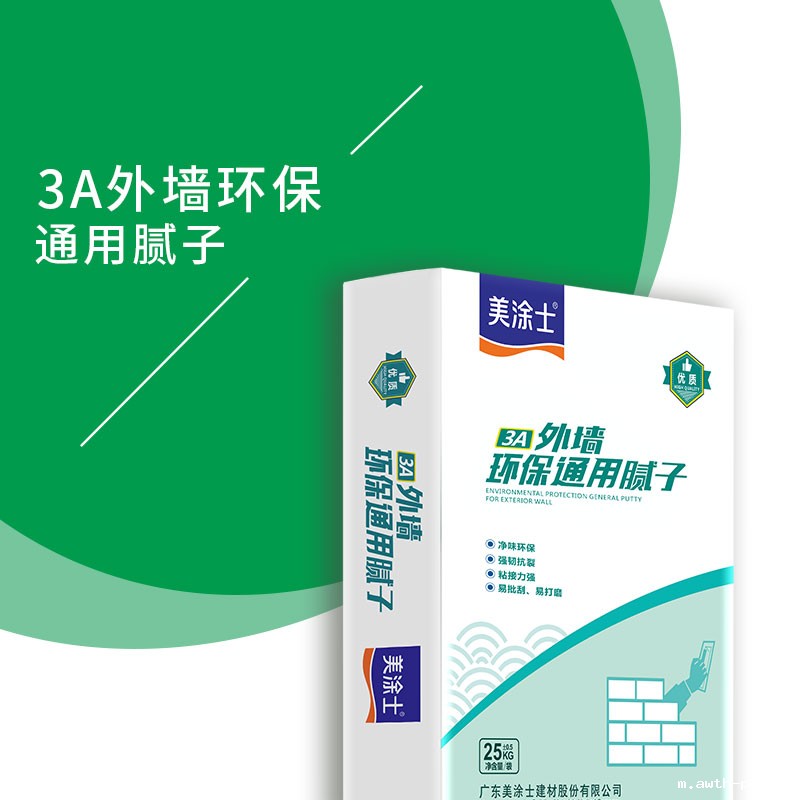 3A外墙环保通用腻子,采用高聚合物,无机粘结力料及精选强度增加剂配制而成。加入拌合剂后,将发生适中的化学反应,生成分子结构很小的凝结体,增加分子间的聚合力,使得产品具有高强度,透水率小、附着力佳及封闭性优等特点。