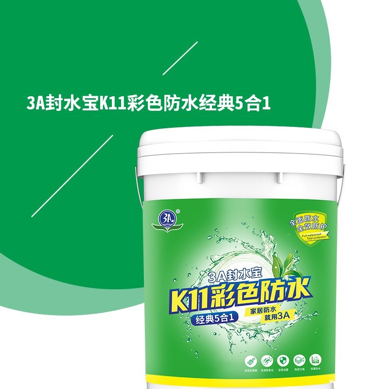 3A封水宝K11彩色防水经典5合1是一种双组份水性防水浆料,采用优质聚合物乳液,以特种水泥和优质填料组成无机粉料,经一定比例配制而成,搅拌后形成浆料。产品具有良好的耐水性、耐碱性、粘结强度高等特性,粉体细腻、施工流平性好,有效避免漏涂。粘结强度高,可用于背水面防水施工,可在无明水的潮湿基面上直接施工。