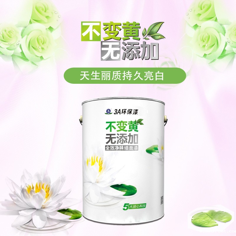 3A不变黄无添加全效净味墙面漆精选净味乳液及优质钛白粉,保持家居墙面持久亮白不变黄;3AGreener创新无添加技术,在产品配方和生产过程中未添加APEO、PFOS、重金属等有害物质,实现即刷即住;全新ANTI-WEAR科技打造坚韧漆膜,可经受20,000次以上反复擦洗,轻松营造持久亮丽、典雅脱俗的家居氛围;更有超强防霉抗碱性能,高效遮盖力,全面解决多种墙面问题。