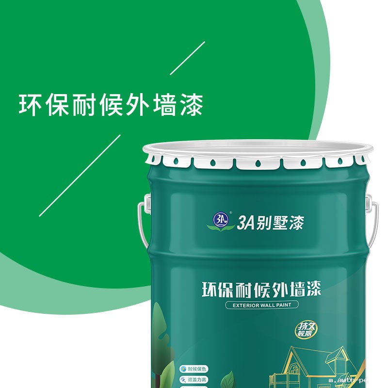 3A别墅漆环保耐候外墙漆由纯丙乳液和硅丙乳液、颜料、助剂组成。该产品具有很好的耐候性和抗污性,耐水、耐碱、耐酸雨腐蚀,与腻子和浮雕底漆及封闭底漆配套使用,具有很好的层间附着力和保护功能。